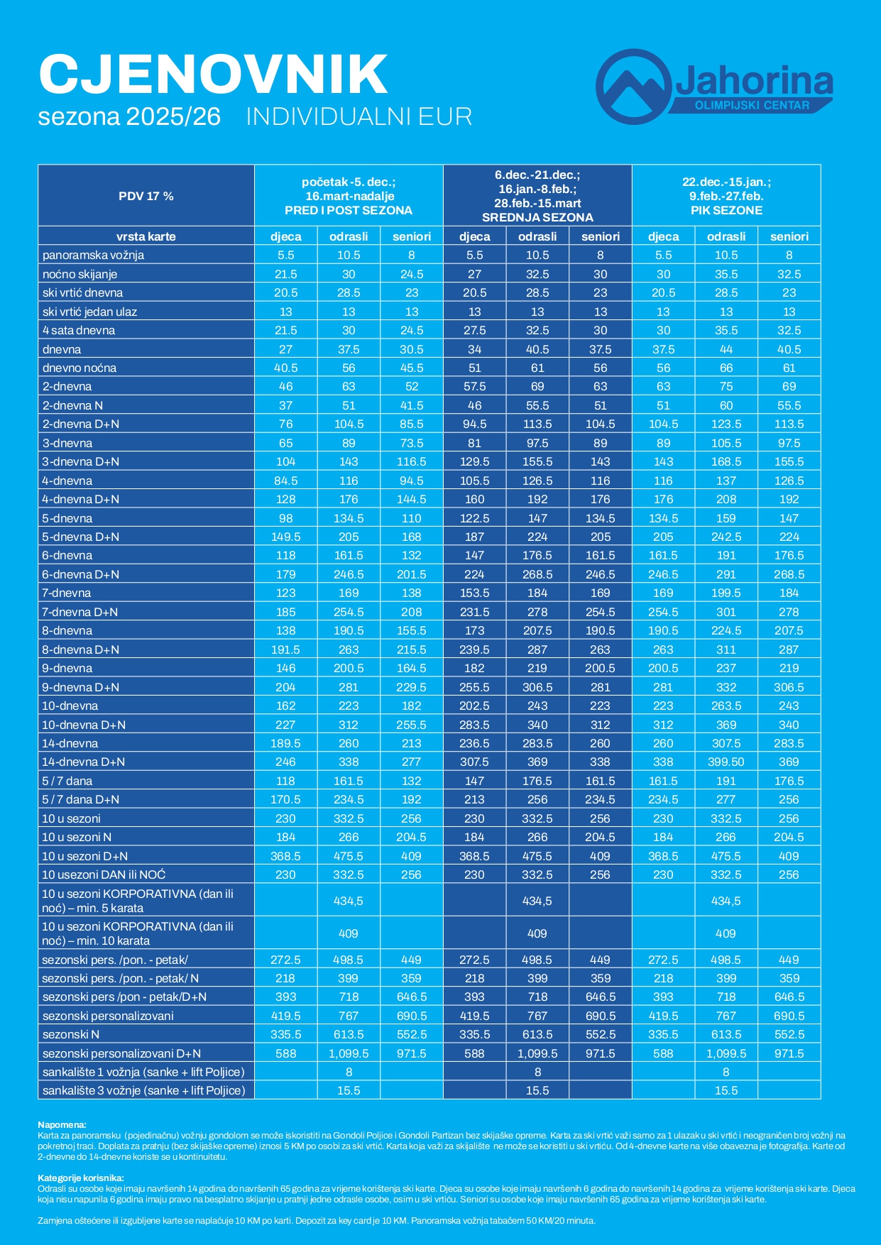 Individualne ski karte – cijene u eurima