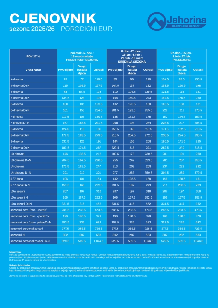 Porodične ski karte – cijene u eurima